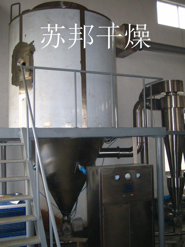 空气经过滤和加热,进入干燥器顶部空气分配器,热空气呈螺旋状均匀地进入干燥室。料液经塔体顶部的高速离心雾化器,(旋转)喷雾成极细微的雾状液珠,与热空气并流接触在极短的时间内可干燥为成品。成品连续地由干燥塔底部和旋风分离器中输出,废气由风机排空。