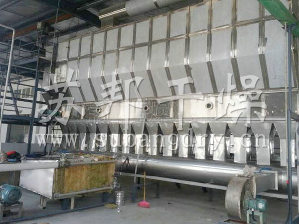 箱式沸腾干燥机又称卧式流化床干燥机,在长期应用过程中进行了不断的改进、提高,在木削粉行业得到了广泛的应用。工作原理为经热风炉加热后的150℃左右的热风由鼓风机吹入流化床热风室内,经阀板分配均匀地进入床体内,从加料器进入的湿物料被热风吹起形成流化状态;由于热风与物料充分接触,因此在较短时间内就可干燥。从床体的一端进入,经过约三^钟的“沸腾”干燥,物料可自动从床体的另一端流出,完成干燥。