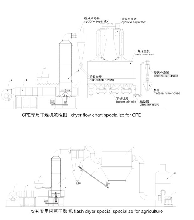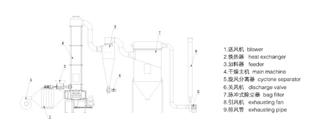 热空气由入口管以适宜的喷动速度从干燥机底部进入搅拌粉碎干燥室,对物料产生强烈的剪切、吹浮、旋转作用,于是物料受到离心、剪切、碰撞、摩擦而被微粒化,强化了传质传热。在干燥机底部,较大较湿的颗粒团在搅拌器的作用下被机械破碎,湿含量较低、颗粒度较小的颗粒被旋转气流夹带上升,在上升过程中进一步干燥。由于气固两相作旋转流动,固相惯性大于气相,固气两相间的相对速度较大,强化两相间的传质传热,所以该机生产强度高。
