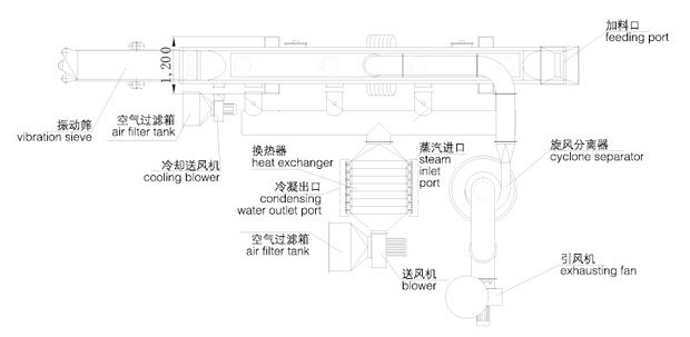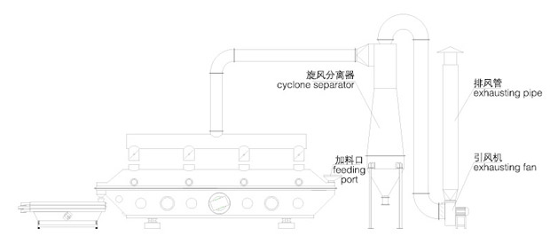 物料自进料口进入机内,在振动力作用下,物料沿水平方向抛掷向前连续运动,热风向上穿过流化床同湿物料换热后,湿空气经旋风分离器除尘后由排风口排出;干燥物料由排料口排出。