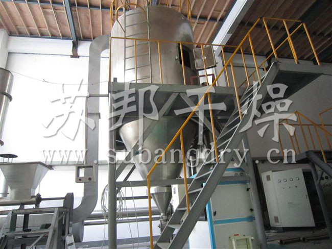 空气经过滤和加热,进入干燥器顶部空气分配器,热空气呈螺旋状均匀地进入干燥室。料液经塔体顶部的高速离心雾化器,(旋转)喷雾成极细微的雾状液珠,与热空气并流接触在极短的时间内可干燥为成品。成品连续地由干燥塔底部和旋风分离器中输出,废气由风机排空。